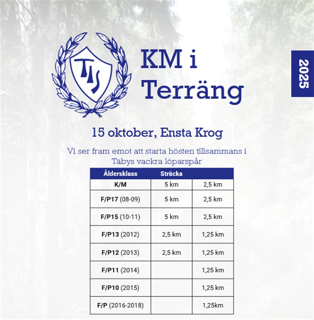Den 15 oktober är det dags för Terräng KM i Ensta! Föra året sprang 140 löpare i blandade åldrar de 3 olika distanserna. Ett utmärkt tillfälle att samla gruppen och springa tillsammans. Anmäl dig här: Täby IS Friidrott - Terräng KM 2025.